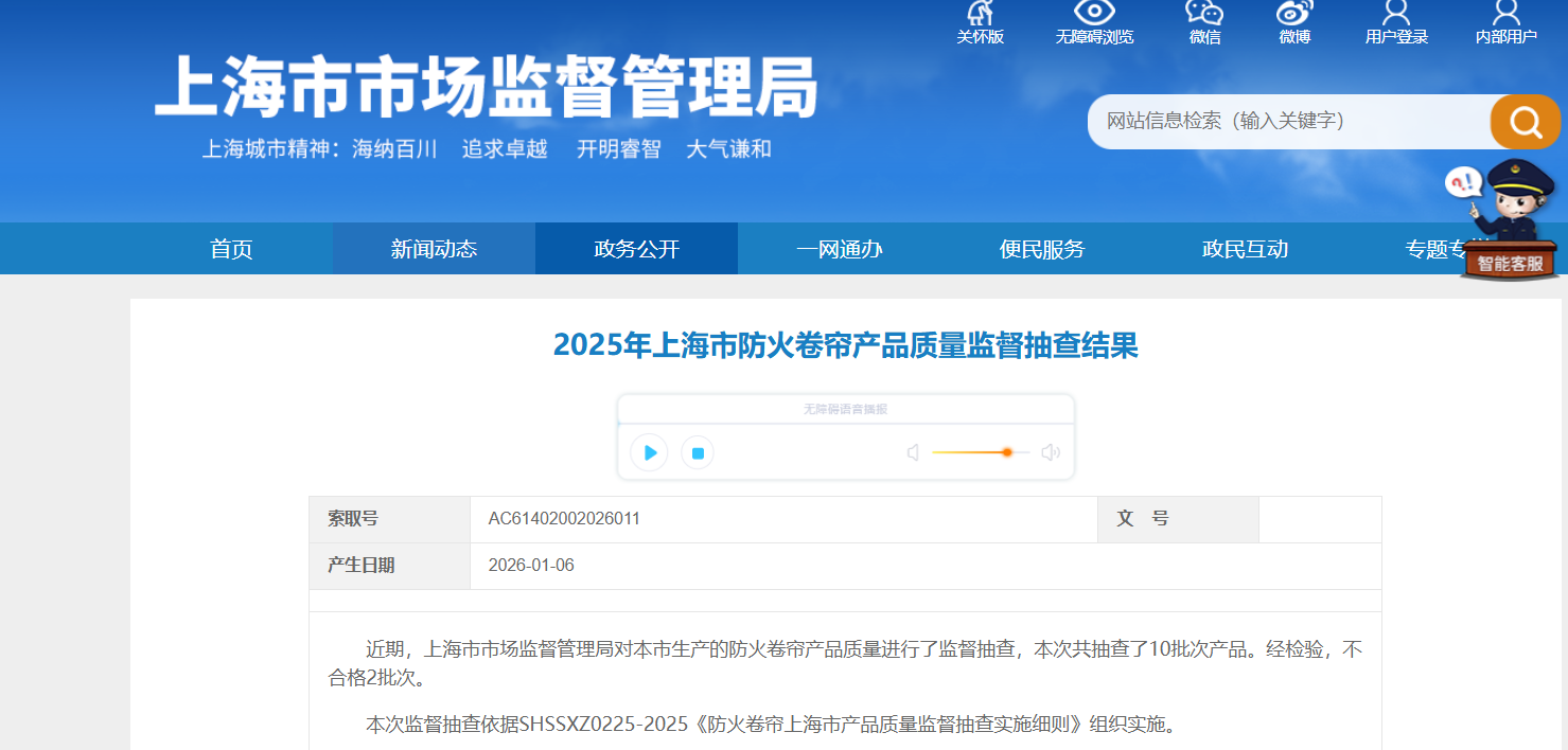 乐居财经 李兰 据上海市市场监督管理局,近期,上海市市场监督管理局对上海市生产的防火卷帘产品质量进行了监督抽查,本次共抽查了10批次产品。经检验,不合格2批次。