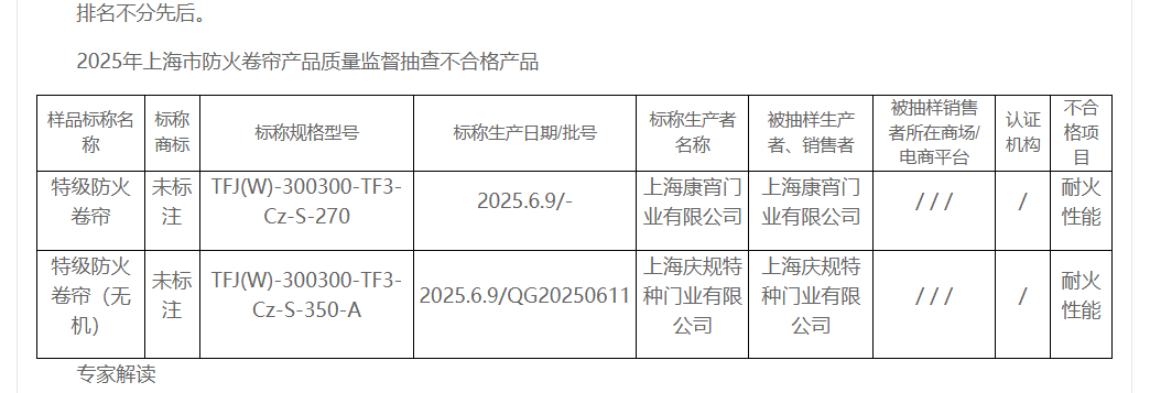 其中,标称生产者“上海康宵门业有限公司”生产的特级防火卷帘产品抽检不合格,标称规格型号:TFJ(W)-300300-TF3-Cz-S-270。不合格项目为耐火性能。