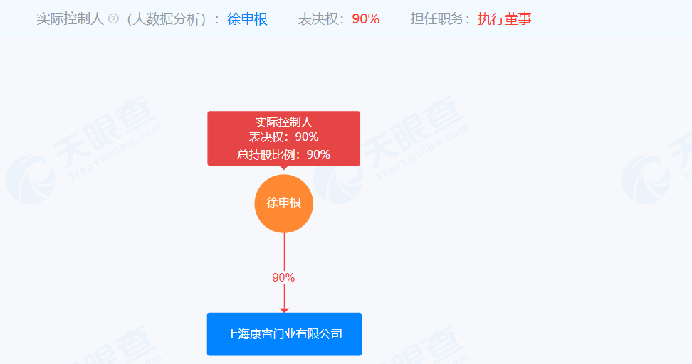 天眼查显示,上海康宵门业有限公司成立于2012年5月,注册资本1298万元,法定代表人徐申根。该公司由实控人徐申根持股90%。